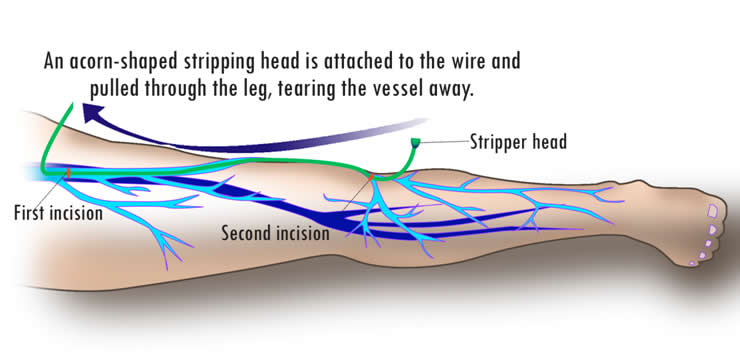 3) Safenectomia: è il trattamento chirurgico convenzionale e prevede un ricovero di poche ore in una struttura ospedaliera, in sale operatorie attrezzate ed in anestesia di tipo spinale. Attraverso una piccola incisione nella piega dell’inguine ed una sul malleolo interno (a livello della caviglia) si isola la vena safena e viene fatto passare, all’interno della vena stessa, un filo plastificato (stripper). Il filo viene quindi agganciato alla parte superiore della vena e viene tirato in basso, rimuovendo la safena per invaginazione. Vengono poi praticate delle microincisioni nelle sedi in cui sia necessario rimuovere delle collaterali venose che sono rimaste in sede dopo la rimozione della vena stessa attraverso degli uncini di Muller. Le incisioni inguinale e malleolare vengono quindi chiuse con punti intradermici e viene infilato un monocollant 35mmHg dedicato per 7gg e successivamente rimosso con controllo EcoColor-Doppler venoso ripetuto a 3 e 12 mesi dalla procedura.