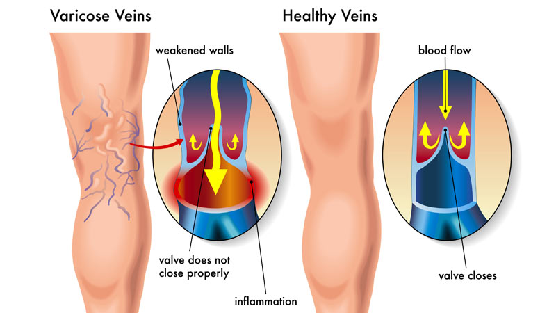 When the vein valves fail to function properly, the veins become enlarged and the blood flow to and from the heart is impaired. The blood simply flows backwards to the legs instead of going up to the heart, and this is sometimes caused by standing up too long.
